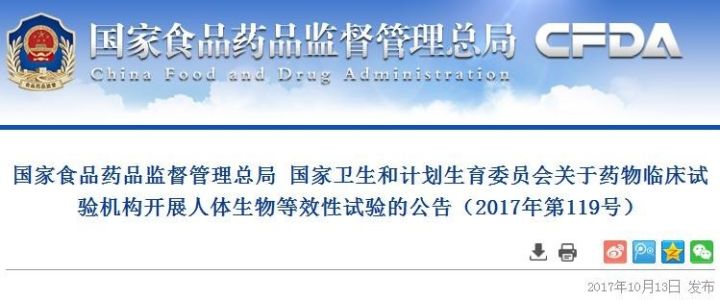 国家食药监局今日发布了《关于药物临床试验机构开展人体生物等效性试验的公告》。